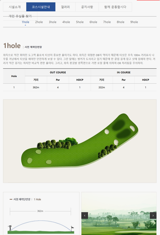 3. 골프 코스에 대한 구체적인 정보가 궁금하다면 '코스시설안내'로 들어가 보세요. 1번 홀부터 각 홀의 전경과 함께 거리, 파, 핸디캡(HDCP) 등의 상세한 수치가 표로 정리되어 있어, 라운딩 전 코스를 미리 파악하고 전략을 세우는 데 도움이 됩니다.