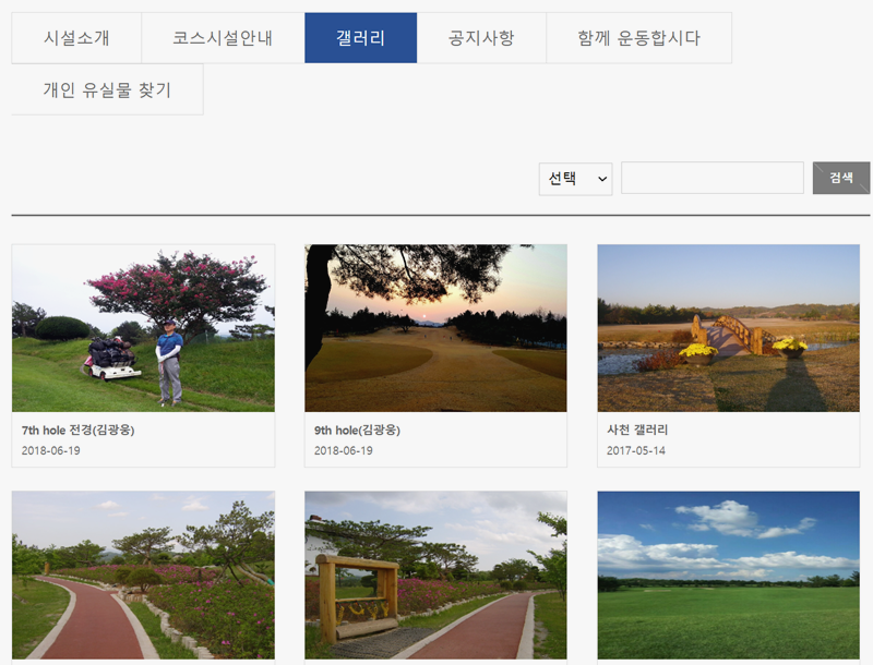 4. '갤러리' 메뉴에서는 사천 체력단련장의 다채로운 풍경을 사진으로 감상할 수 있습니다. 아름다운 자연과 잘 가꾸어진 필드, 시설물의 모습을 통해 방문 전에 미리 그곳의 분위기를 느껴볼 수 있어 방문 계획에 설렘을 더해줍니다.