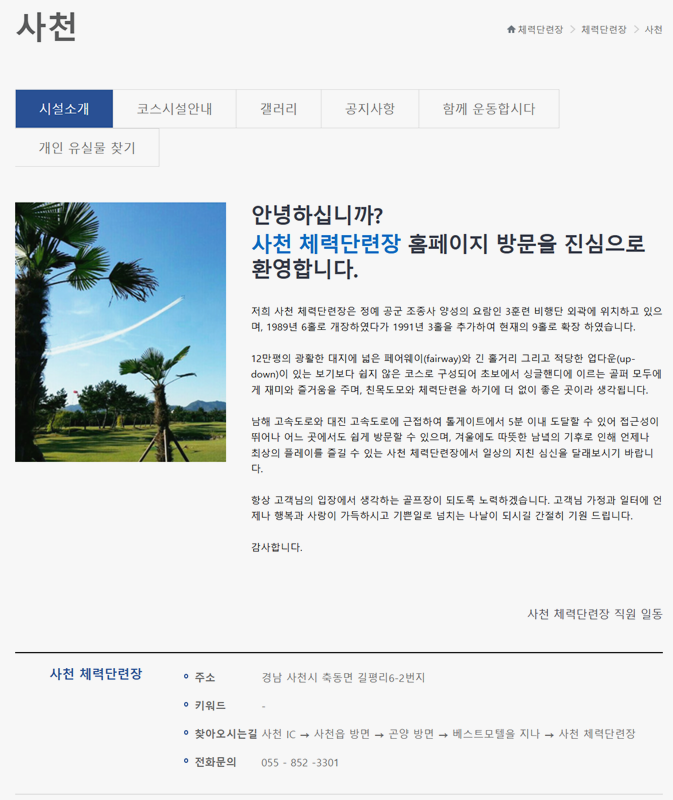 2. 사천 체력단련장 페이지에 접속하면 가장 먼저 방문을 환영하는 인사말을 볼 수 있습니다. '시설소개' 메뉴에서는 1989년 개장 이래의 역사와 넓은 페어웨이, 적절한 업다운 등 코스의 특징에 대한 자세한 설명을 읽어볼 수 있습니다.