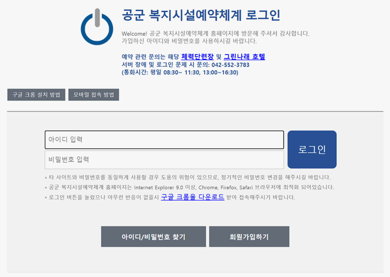 [공군 복지시설 예약체계 - https://welfare.airforce.mil.kr:446]