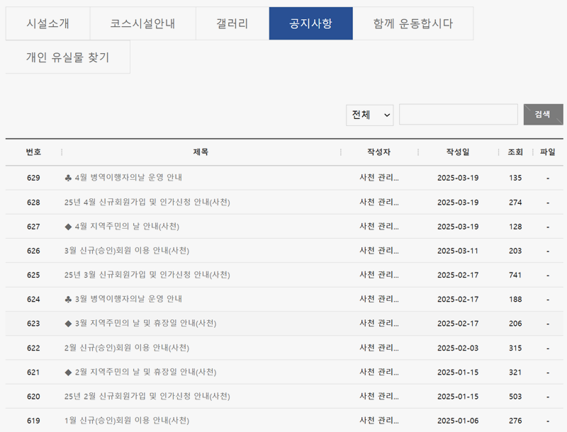 5. 방문 전 반드시 확인해야 할 '공지사항' 메뉴입니다. 이곳에서는 병역이행자의 날 운영 안내, 신규 회원 가입 및 휴장일 안내 등 시설 이용과 관련된 중요한 소식들이 정기적으로 올라오므로, 최신 정보를 확인하여 이용에 차질이 없도록 하는 것이 좋습니다.