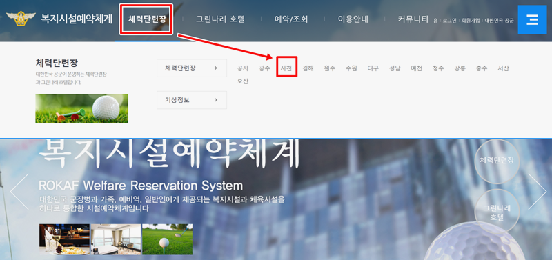 경남 사천에 자리한 공군 체력단련장의 상세한 시설 정보와 코스 안내를 확인하고, 이용 예약을 진행할 수 있는 공식 온라인 창구입니다. 사천 공군 체력 단련장 홈페이지는 공군 복지시설 예약체계 홈페이지에서 이용 가능 합니다.