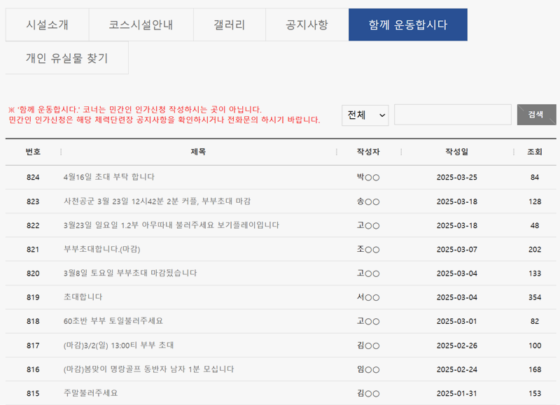 6. '함께 운동합시다'는 일종의 커뮤니티 게시판으로, 동반자를 찾기 위한 공간입니다. 다른 이용자들이 올린 게시물을 통해 원하는 날짜나 시간대에 함께 라운딩할 파트너를 구하거나, 직접 글을 작성하여 새로운 골프 친구를 만날 수 있습니다.