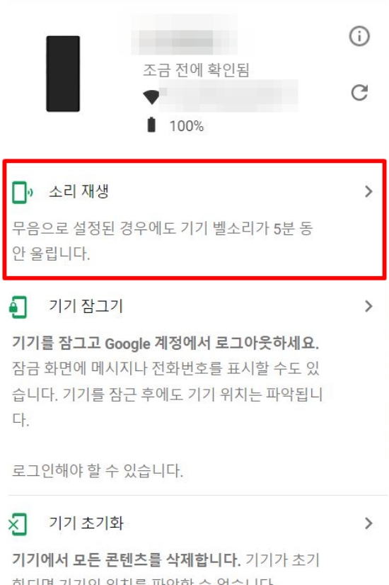 5. 기기를 선택하고 나면 여러 관리 메뉴가 나타납니다. 그중 '소리 재생'을 선택하면 핸드폰이 무음이나 진동으로 설정되어 있더라도 최대 볼륨으로 5분 동안 벨소리가 울리게 할 수 있어요. 집 안에서 핸드폰을 찾지 못할 때 특히 유용한 기능입니다.