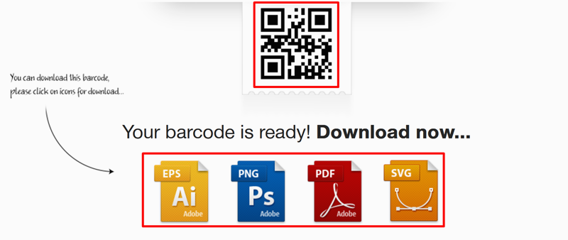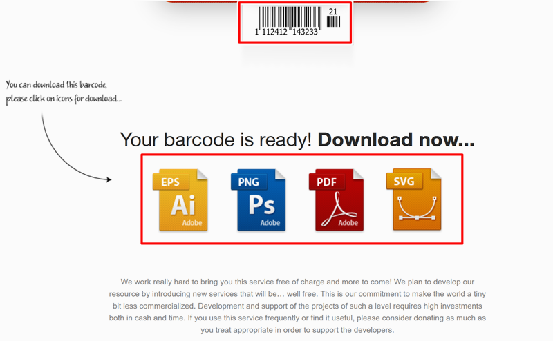 3. 바코드가 만들어지면 바로 위에서 결과물을 미리 볼 수 있고, 아래에서는 파일을 내려받을 수 있습니다. 사용 목적에 맞게 EPS, PNG, PDF, SVG 등 다양한 파일 형식 중 하나를 선택하면 돼요. 예를 들어 웹에 올릴 거라면 PNG, 인쇄물에 사용하려면 SVG나 PDF가 유용하답니다.