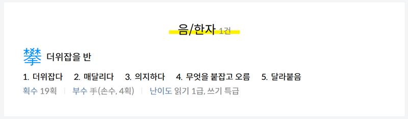 5. 한자에 대한 핵심 정보만 요약해서 보여주는 부분이에요. 큰 글씨로 한자 모양을 다시 한번 확인하고, 그 옆에서 '더위잡을 반'이라는 음과 훈을 볼 수 있습니다. 총 19획으로 이루어져 있으며, 부수는 손을 의미하는 '手'이고, 읽기 1급, 쓰기 특급 수준의 한자라는 점도 알 수 있네요.