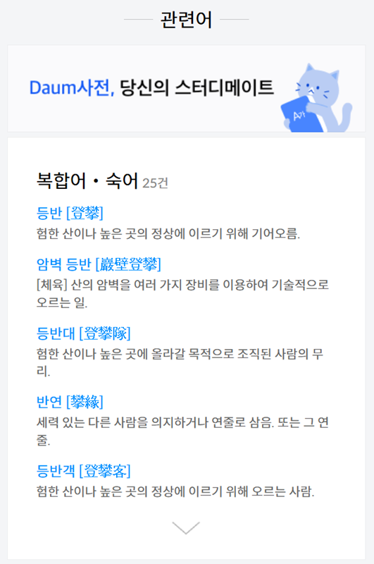7. 마지막으로, 검색한 한자와 관련된 복합어나 숙어를 모아 보여주는 공간이에요. '등반', '암벽 등반'과 같이 앞에서 보았던 단어들뿐만 아니라 '반연', '등반객' 등 더 다양한 관련 어휘들이 소개됩니다. 이를 통해 어휘력을 확장하는 데 유용하게 쓸 수 있습니다.