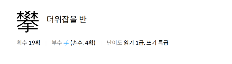 5. 한자에 대한 핵심 정보만 요약해서 보여주는 부분이에요. 큰 글씨로 한자 모양을 다시 한번 확인하고, 그 옆에서 '더위잡을 반'이라는 음과 훈을 볼 수 있습니다. 총 19획으로 이루어져 있으며, 부수는 손을 의미하는 '手'이고, 읽기 1급, 쓰기 특급 수준의 한자라는 점도 알 수 있네요.