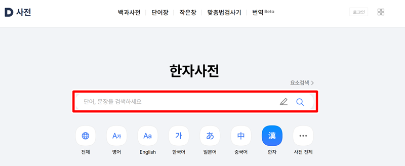 1. 온라인 한자사전의 첫 화면이에요. 중앙에 위치한 입력창에 찾고 싶은 단어나 문장을 넣고 검색을 시작할 수 있습니다. 아래쪽에는 영어, 일본어, 중국어 등 다른 언어 사전으로 바로 이동할 수 있는 메뉴들이 나란히 정렬되어 있어 편리하게 활용 가능해요.