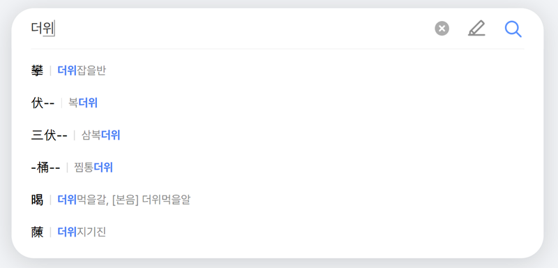 2. 검색창에 '더위'라고 입력하자, 이와 관련된 여러 한자와 단어들이 목록으로 나타나는 것을 볼 수 있어요. '攀(더위잡을 반)'부터 '伏(복더위)', '三伏(삼복더위)'까지 다양한 결과가 제시되어, 사용자가 찾으려는 것과 가장 가까운 항목을 쉽게 고를 수 있도록 도와줍니다.