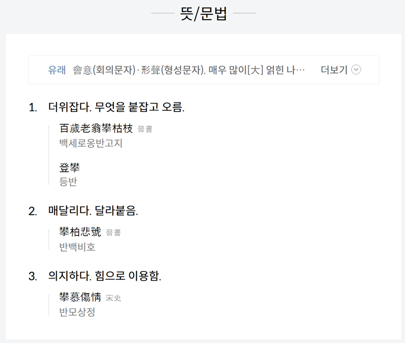 6. 여기서는 한자가 가진 구체적인 의미를 번호순으로 자세히 풀어줍니다. 1번 뜻인 '더위잡다' 부터 '매달리다', '의지하다'까지 각 의미에 대한 설명과 함께, 실제 고전 문헌에서 사용된 예시 문장까지 덧붙여져 있어 한자의 쓰임새를 더 깊이 이해할 수 있습니다.