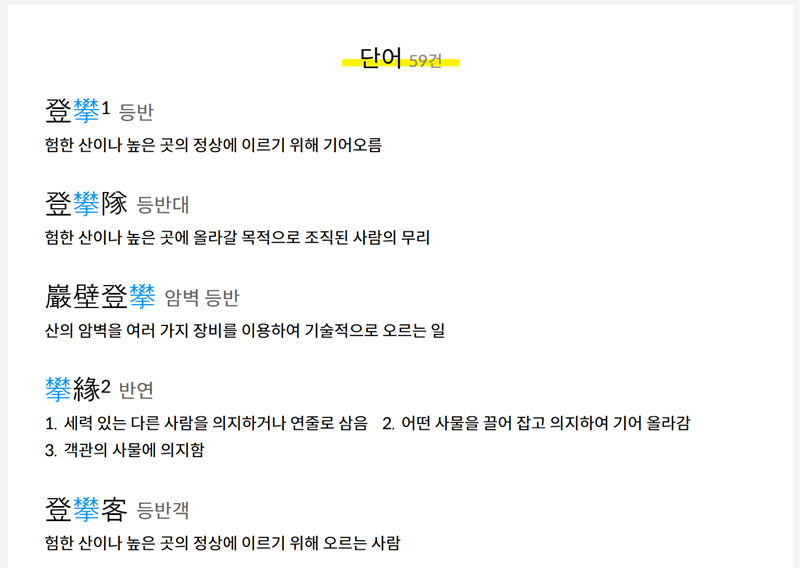 7. 마지막으로, 검색한 한자와 관련된 복합어나 숙어를 모아 보여주는 공간이에요. '등반', '암벽 등반'과 같이 앞에서 보았던 단어들뿐만 아니라 '반연', '등반객' 등 더 다양한 관련 어휘들이 소개됩니다. 이를 통해 어휘력을 확장하는 데 유용하게 쓸 수 있습니다.