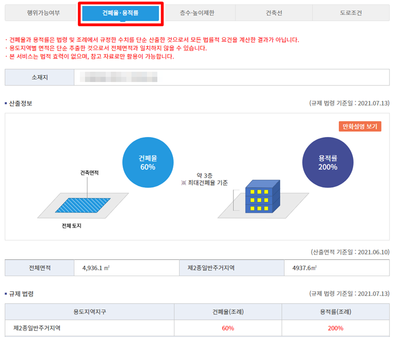 5. '건폐율·용적률' 항목을 선택하면 해당 토지에 지을 수 있는 건축물의 최대 건축면적과 연면적 비율을 그림과 함께 쉽게 이해할 수 있도록 보여줍니다. 법률과 조례에 따른 정확한 건폐율과 용적률 상한을 표로 정리해 주어 편리합니다.