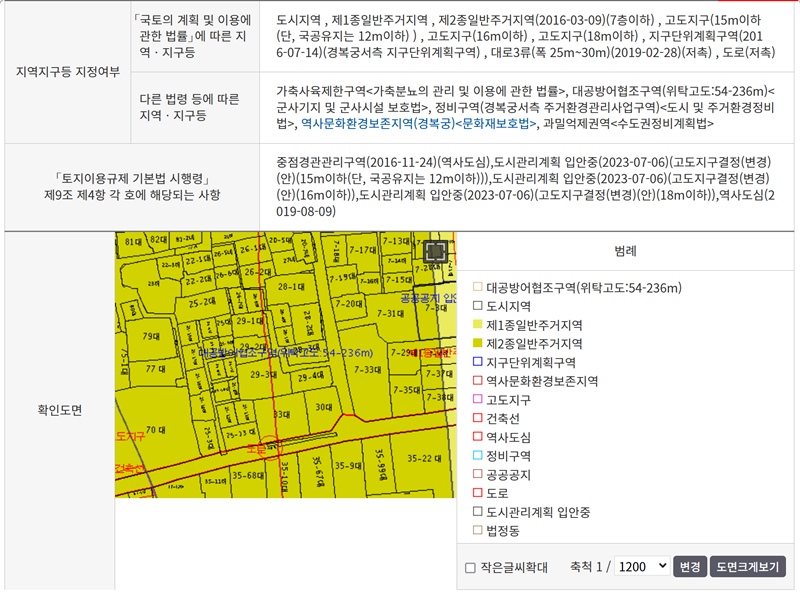 3. '지역·지구 등 지정여부' 항목에서는 국토계획법이나 다른 법령에 따라 해당 토지가 어떤 용도지역으로 지정되어 있는지 텍스트로 명확하게 보여줍니다. 또한, 확인도면을 통해 지적도상에 용도지역이 어떻게 표시되는지 시각적으로 파악할 수 있습니다.