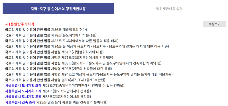4. '지역·지구 등 안에서의 행위제한내용'에서는 해당 용도지역에 적용되는 법률 조항들을 나열해 보여줍니다. 예를 들어, 제1종일반주거지역이라면 건축물의 허가, 용도, 건폐율, 용적률 등에 관한 법규 목록을 한눈에 확인할 수 있습니다.