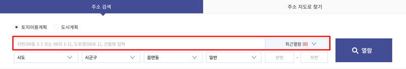 1. 주소 검색창에 확인하고 싶은 토지의 지번이나 도로명 주소를 정확하게 입력한 후 '열람'을 누르면 해당 토지의 상세 정보를 조회할 수 있습니다. 시, 도, 시군구, 읍면동을 직접 선택해서 주소를 찾아 들어가는 것도 가능합니다.