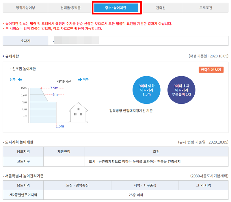 6. '층수·높이제한' 항목에서는 건축 가능한 건물의 높이와 관련된 규제 사항을 확인할 수 있습니다. 일조권 확보를 위한 높이 제한이나 도시계획에 따른 층수 제한 등 복잡한 내용을 그림과 표로 알기 쉽게 설명해 줍니다.