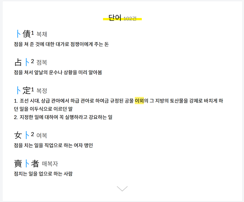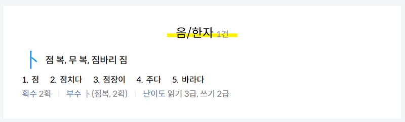 5. 검색 결과 화면에서는 선택한 한자의 음과 뜻을 가장 먼저 확인할 수 있습니다. 예를 들어 '점 복'이라는 글자를 찾았다면, 그에 해당하는 상세한 풀이가 나타납니다.