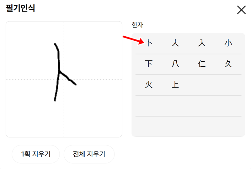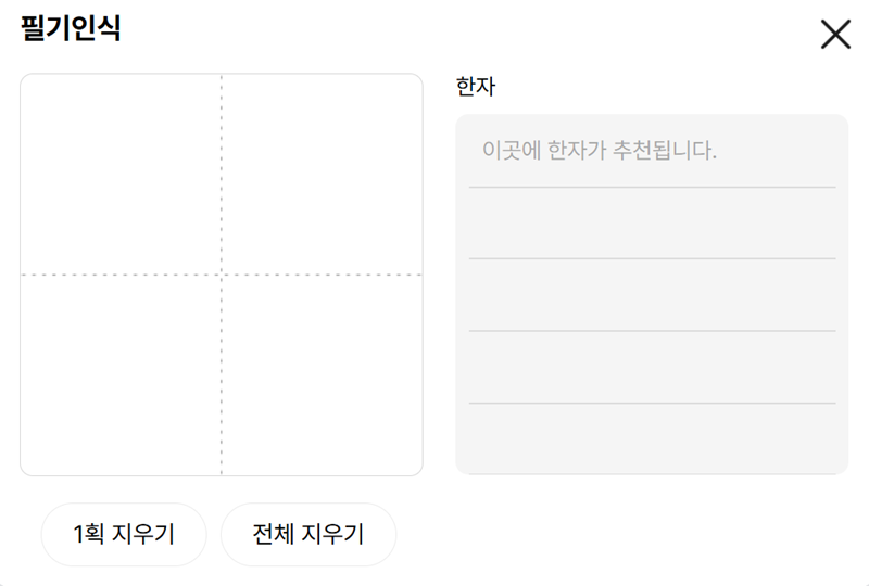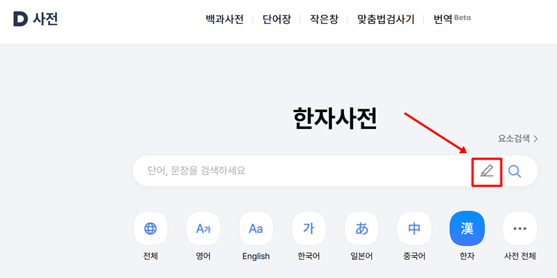 1. 한자사전 검색창 오른쪽에 위치한 연필 모양의 아이콘을 누르면 필기 인식기가 나타납니다. 이곳에서 모르는 한자를 직접 그려서 찾아볼 수 있는 준비를 시작합니다.