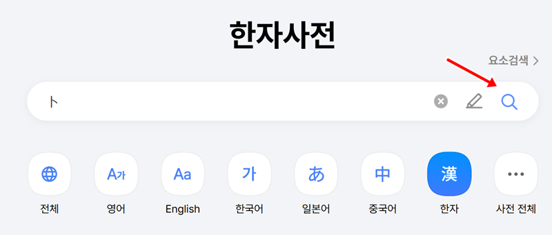 4. 원하는 한자를 고르면 검색창에 자동으로 입력됩니다. 이제 오른쪽에 있는 돋보기 모양을 눌러 해당 한자에 대한 자세한 정보를 확인하러 넘어갑니다.