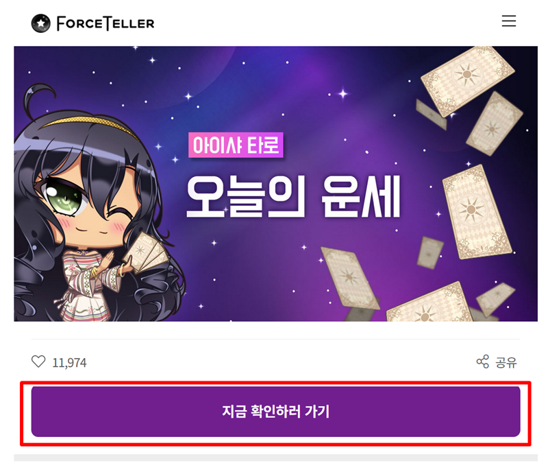 1. 홈페이지에 들어가면 '오늘의 운세'와 함께 '지금 확인하러 가기'라는 문구가 보입니다. 이곳을 통해 다가올 나의 한 주간의 흐름을 미리 살펴볼 수 있는 타로점을 볼 수 있으니, 망설이지 말고 선택하여 다음 단계로 넘어가 주세요.
