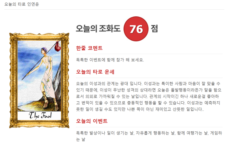 10. 카드를 선택하면 '오늘의 조화도' 점수와 함께 당신이 뽑은 카드의 해석을 볼 수 있습니다. 오늘의 타로 운세, 이벤트 등 종합적인 내용을 통해 오늘 하루 다른 사람과의 관계를 어떻게 만들어가면 좋을지에 대한 힌트를 얻을 수 있습니다.