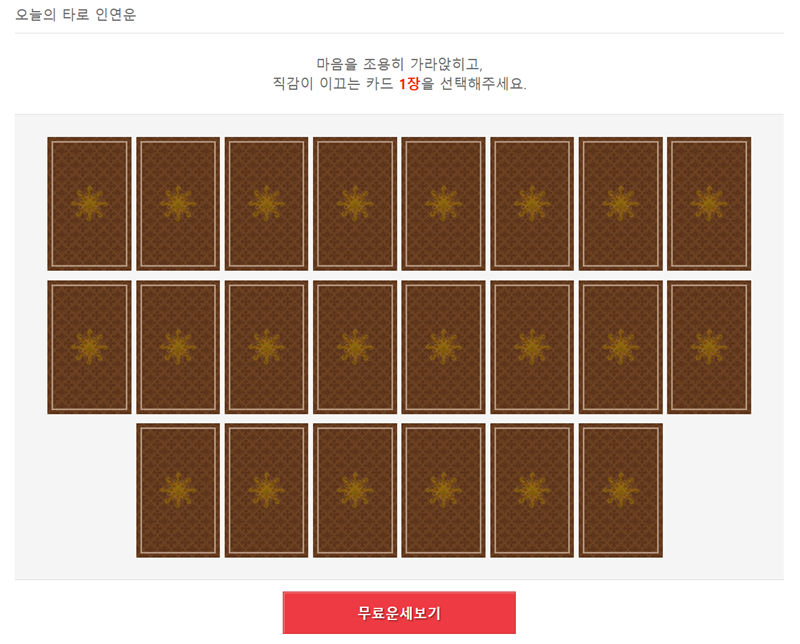 8. 무료운세 페이지로 들어가면 오늘의 운세, 주간/월간 운세 등 다양한 항목이 보입니다. 그중 '오늘의 타로 인연운'처럼 타로를 활용한 콘텐츠를 선택하면 새로운 관계나 인연에 대한 조언을 얻을 수 있습니다.