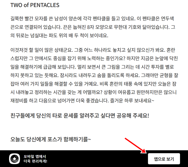 5. 화면을 아래로 내리면 카드의 이름과 함께 더욱 상세한 해석을 읽어볼 수 있습니다. 현재 당신의 상황과 앞으로 나아갈 방향에 대한 깊이 있는 조언이 담겨있으니 꼼꼼히 읽어보는 것이 좋습니다. 더 편하게 보고 싶다면 '앱으로 보기'를 이용할 수도 있습니다.