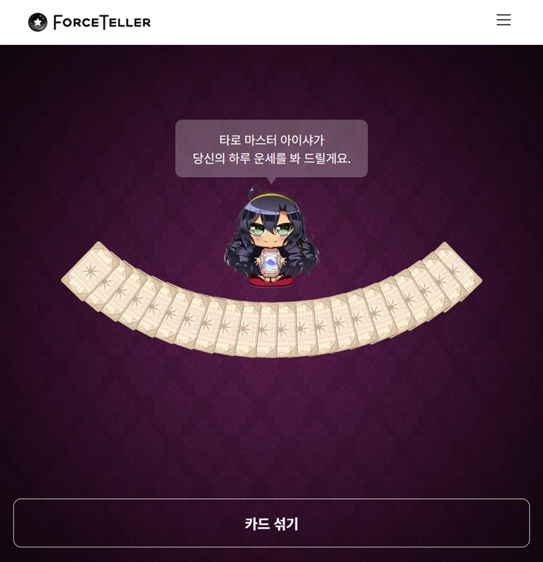 2. 다음 화면으로 넘어가면 타로 마스터 캐릭터가 나타나 당신의 하루 운세를 봐주겠다고 안내합니다. 화면 아래쪽에는 카드를 섞을 수 있는 공간이 마련되어 있습니다. 진지한 마음으로 임하며 카드를 잘 섞어주세요.