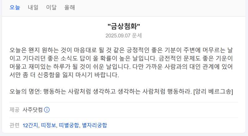 4. 상단 메뉴에서 '내일'을 선택하면 바로 다음 날의 운세도 미리 알아볼 수 있어요. 내일의 하루를 어떻게 보내는 것이 좋을지, 어떤 행동은 자제하는 것이 유리할지에 대해 알려주어 하루를 준비하는 데 도움이 될 수 있어요.