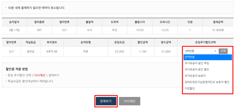9. 결제를 진행하기 전 마지막으로 예매 내용을 확인하는 단계입니다. 할인 적용이 가능한 경우 '운임할인선택' 목록에서 해당하는 항목을 고를 수 있습니다. 모든 정보가 맞는지 검토한 후 '결제하기'를 선택해 주세요.