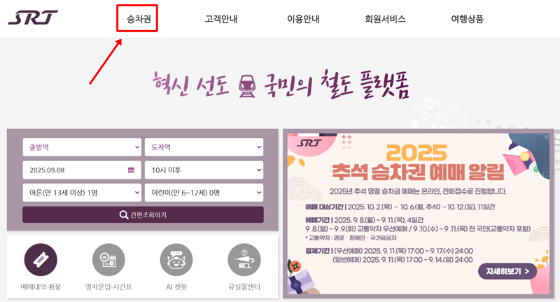 1. SR 에스알 홈페이지에 접속한 다음 홈페이지 상단에 있는 여러 메뉴 중에서 가장 왼쪽에 위치한 '승차권'이라는 항목으로 마우스 커서를 가져가 보세요. 승차권 예매와 관련된 다양한 하위 메뉴들이 나타나면서 예약을 위한 첫 단계가 시작됩니다.