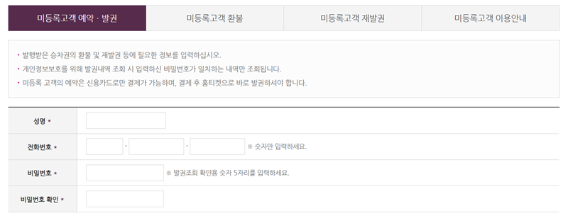 7. '미등록고객 예매'를 선택했다면 이름과 전화번호, 그리고 예매 내용을 다시 확인하기 위해 사용할 비밀번호를 입력하는 화면이 나옵니다. 모든 정보를 정확하게 기입해야 나중에 불이익이 없습니다.