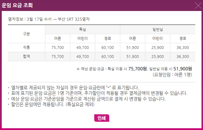 5. 각 열차편의 운임이 궁금하다면 운행 시간 옆에 있는 '보기'를 눌러 확인할 수 있습니다. 어른, 어린이, 경로 등 대상에 따라 그리고 특실과 일반실 좌석에 따라 운임이 어떻게 다른지 상세한 표로 안내되어 예산을 짜는 데 도움이 됩니다.