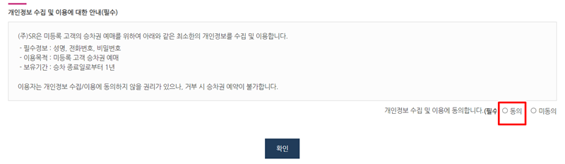 8. 다음으로 개인정보 수집 및 이용에 대한 안내를 읽고 내용에 동의해야 합니다. 원활한 예매 절차를 위해 필수적인 과정이므로, 내용을 확인한 후 '동의' 항목에 표시하고 아래의 '확인'을 눌러주세요.