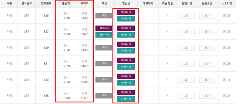 4. 조회를 마치면 해당 구간을 운행하는 열차들의 목록이 시간 순서대로 나타납니다. 각 열차의 출발 및 도착 시각을 꼼꼼히 확인하고, '예약하기'나 '좌석선택' 표시가 있는 시간대 중에서 원하는 것을 고르면 됩니다. '매진'이라고 표시된 열차는 이미 좌석이 모두 판매된 상태입니다.
