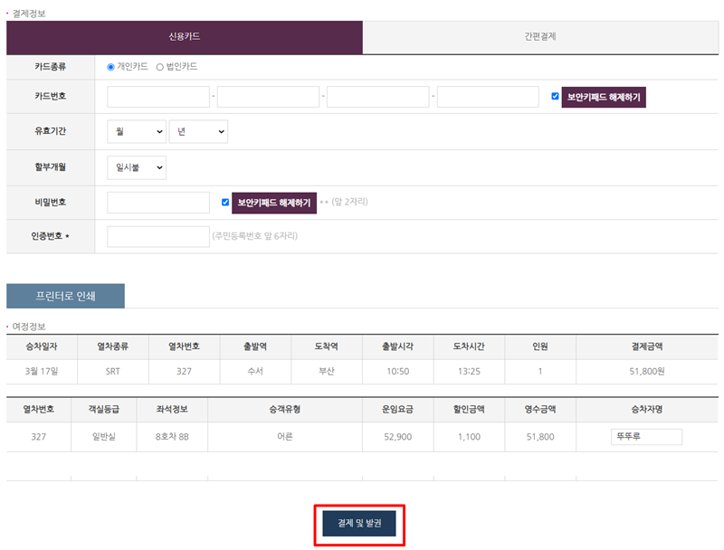 10. 마지막으로 결제 정보를 입력하는 화면입니다. 사용할 카드의 종류와 번호 등 필요한 내용을 모두 기입한 후, 맨 아래에 있는 '결제 및 발권'을 누르면 모든 예매 과정이 성공적으로 마무리됩니다.