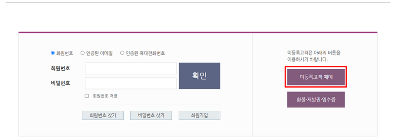 6. 원하는 시간대의 열차를 골랐다면 이제 로그인 화면으로 넘어가게 됩니다. 만약 계정이 없다면 회원가입을 하지 않더라도 오른쪽에 보이는 '미등록고객 예매'를 통해 다음 절차를 계속 진행할 수 있습니다.