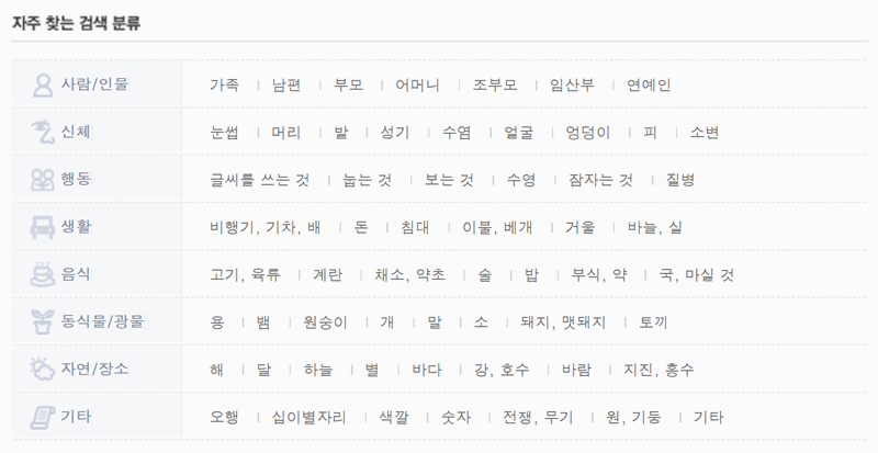 6. 만약 꿈의 의미를 찾기 어려운 경우 메인화면의 자주 찾는 검색 분류를 활용해 보세요. 꿈 해몽 사이트에서는 사람/인물, 신체, 행동, 생활, 음식, 동식물/광물, 자연/장소, 기타 등 다양한 카테고리로 나누어져 있어 쉽게 꿈의 의미를 찾을 수 있답니다. 자신이 꾼 꿈에 맞는 카테고리를 통해 빠르게 해몽을 확인할 수 있으니 이를 활용하면 더 수월하게 꿈 풀이를 할 수 있어요.