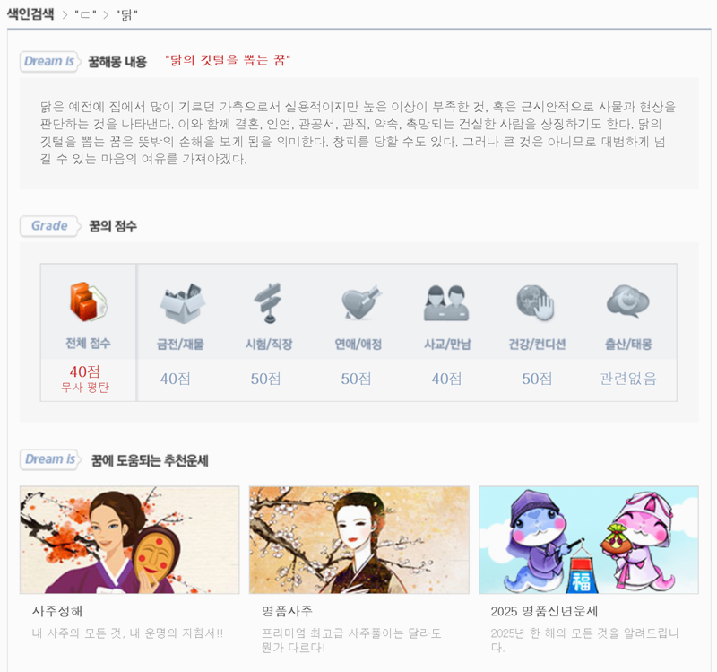5. 꿈 상황과 비슷한 내용을 찾으면 그에 맞는 꿈의 해몽을 확인할 수 있을 뿐만 아니라 해당 풀이와 함께 점수와 추천 운세도 확인할 수 있어요. 꿈에 대한 해석뿐만 아니라 그날의 운세나 미래에 대한 조언도 함께 얻을 수 있어 유용하답니다.