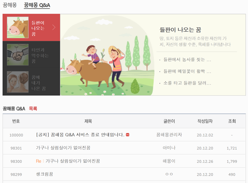 7. 현재 꿈 해몽 Q&A 서비스는 종료되었지만 과거에 사람들이 궁금한 꿈을 묻고 답하는 방식으로 해몽을 찾을 수 있었어요. 예전에는 Q&A를 통해 다른 사람들의 꿈 해몽을 참고하거나 직접 질문을 올려 꿈의 의미를 알아볼 수 있었답니다. 비록 서비스는 종료되었지만 Q&A에서 얻은 해몽들은 여전히 유용하게 참고할 수 있으니 예전 답변들을 찾아보는 것도 하나의 방법이 될 수 있어요.