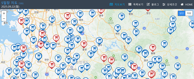 8. 해당 사이트에 접속하면 우리나라 지도 위에 각 지역의 5일장 위치가 날짜와 함께 아이콘으로 표시됩니다. 이를 통해 내가 있는 곳 주변이나 여행지의 장날 정보를 한눈에 직관적으로 파악할 수 있어 매우 편리합니다.