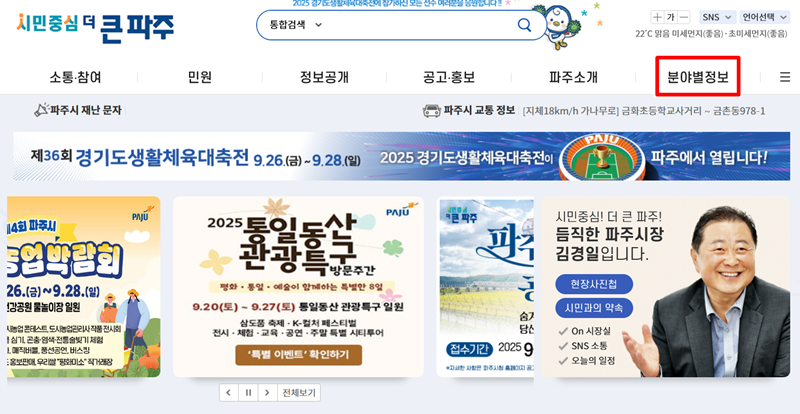 1. 지자체 홈페이지에 방문하면 상단 메뉴에서 다양한 정보 분류를 볼 수 있습니다. 여기서 시민 생활과 밀접한 여러 분야의 정보를 모아놓은 '분야별 정보' 항목을 찾아 들어가면 다음 단계로 진행할 수 있습니다.