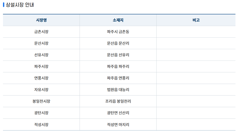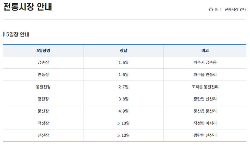 지역마다 닷새 간격으로 열리는 전통시장의 개장 정보를 한눈에 볼 수 있도록 정리한 안내입니다. 이를 활용하면 방문하고 싶은 지역의 시장 이름과 열리는 날짜, 위치 등을 손쉽게 파악할 수 있어요. 전국 오일장 일정표 지도는 각 지역 지자체 홈페이지에서 찾아볼 수 있으며, 예시로 파주시청 홈페이지에서 확인하는 과정을 살펴보겠습니다.