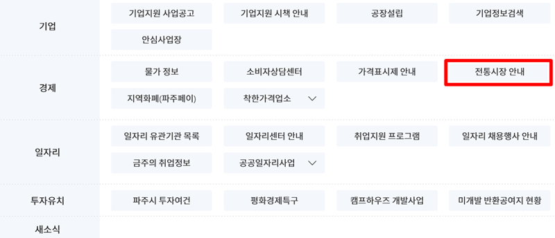 3. '기업/경제/일자리'와 관련된 여러 가지 지원 사업이나 소식들 중에서 '경제' 영역을 살펴보면 '전통시장 안내'라는 항목을 발견할 수 있습니다. 이곳에서 지역 내 시장들에 대한 종합적인 정보를 얻을 수 있습니다.