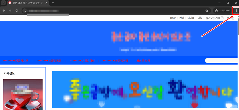 2. 마음에 드는 카페를 찾았다면 해당 페이지로 이동합니다. 그 다음, 웹 브라우저의 오른쪽 위에 있는 세 개의 점으로 된 메뉴를 열어주세요. 이곳에는 현재 보고 있는 페이지와 관련된 여러 가지 유용한 기능들이 숨어있습니다.