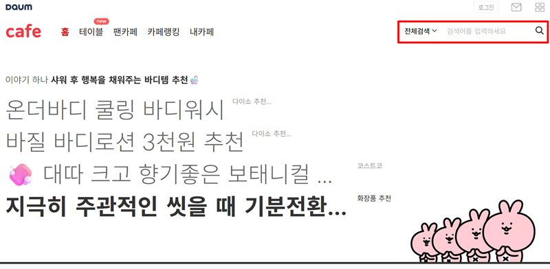 1. 다음 카페 홈페이지에 접속하면 상단 오른쪽에 검색창이 있습니다. 이곳을 통해 내가 활동하고 싶은 커뮤니티의 이름을 입력하여 손쉽게 찾아볼 수 있어요. 전체 검색 범위를 설정하거나 특정 검색어를 입력하여 원하는 카페를 발견해 보세요.