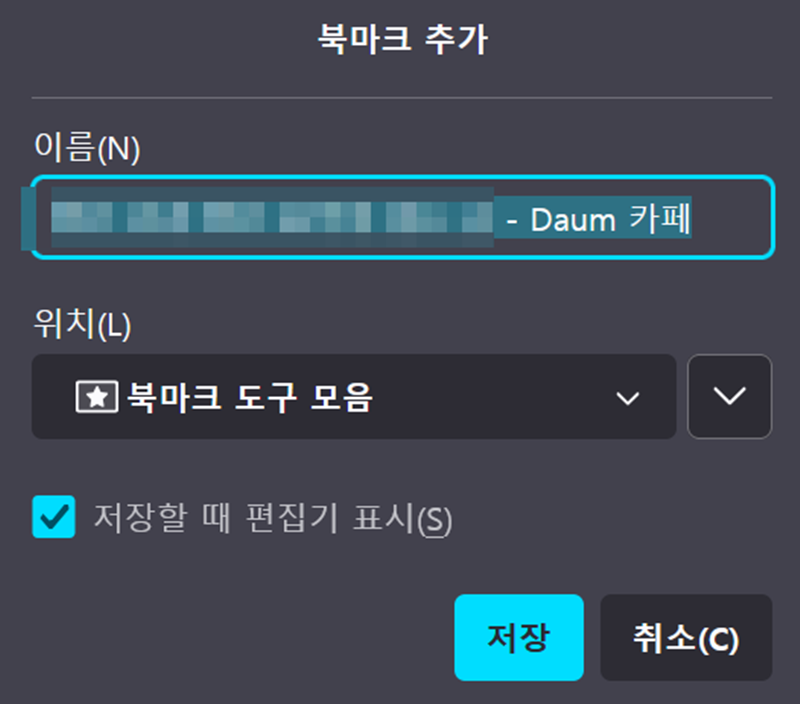 7. 별 모양을 누르면 '북마크 추가'라는 창이 나타납니다. 여기서 저장될 북마크의 이름과 위치를 지정할 수 있어요. 이름과 위치를 확인한 후 '저장'을 누르면 브라우저의 북마크 모음에 해당 카페가 추가되어 언제든 쉽게 방문할 수 있습니다.