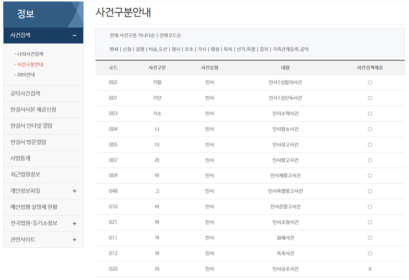 5. 사건번호에 포함된 '가합'이나 '노'와 같은 사건 구분이 낯설게 느껴진다면, 좌측의 '사건구분안내'를 통해 도움을 받을 수 있습니다. 이곳에서는 각 부호가 어떤 종류의 재판을 의미하는지 상세한 목록을 보여주어 정확한 정보를 기입하는 데 유용합니다.