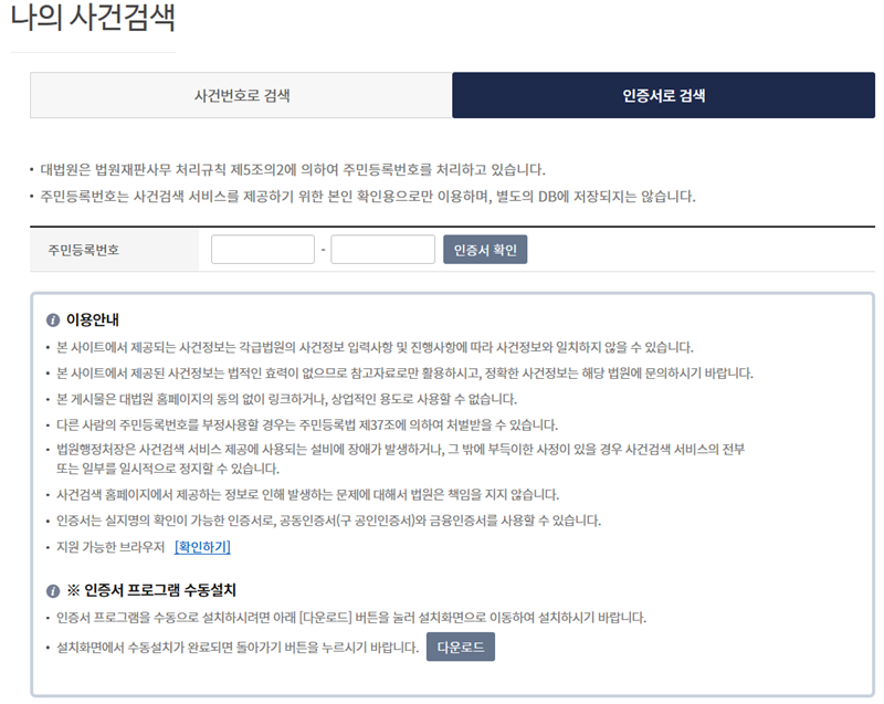 4. 만약 사건번호를 모르거나 더 간편한 방법을 원한다면 '인증서로 검색'을 이용할 수도 있습니다. 이 방식은 주민등록번호를 기입하고 개인 인증서를 통해 본인임을 확인하는 절차를 거치게 되며, 이를 위해 별도의 프로그램 설치가 필요할 수 있습니다.